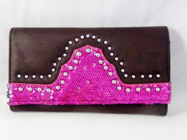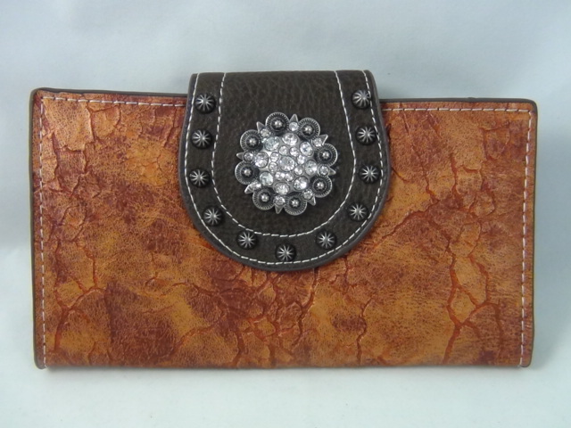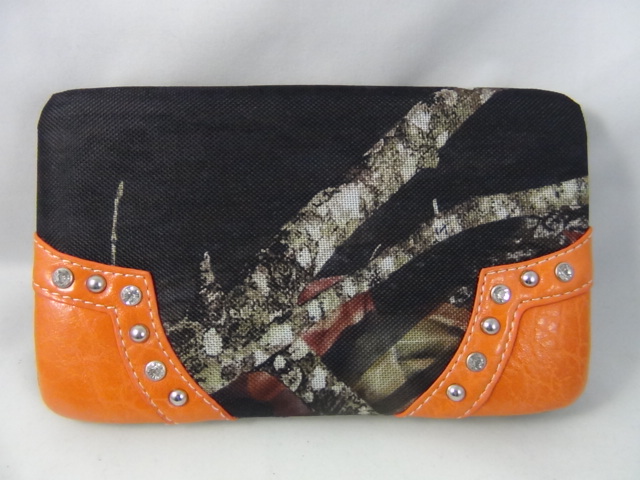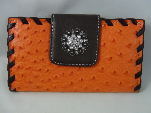 Orange Faux Ostrich With Black Trim Wallet With A Rhinestone Conch