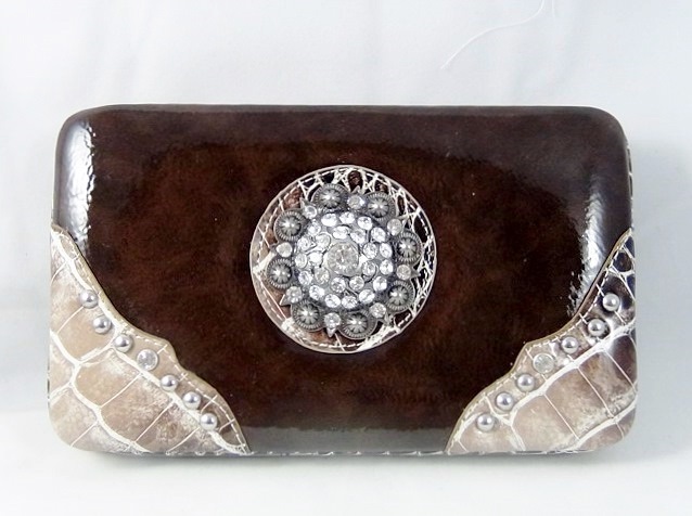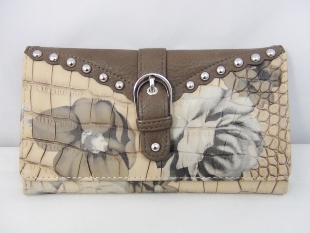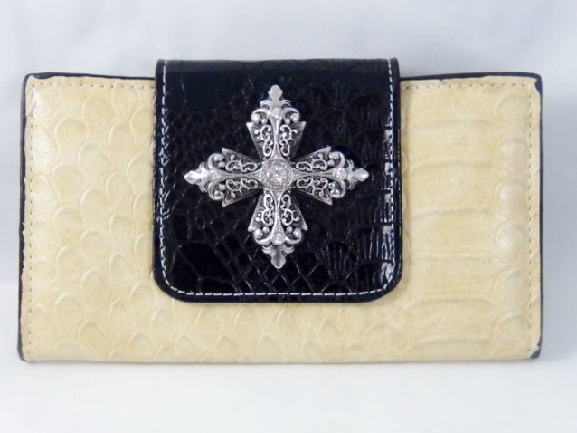 Black Faux Ostrich and Beige Trim Wallet With a Rhinestone Conch
