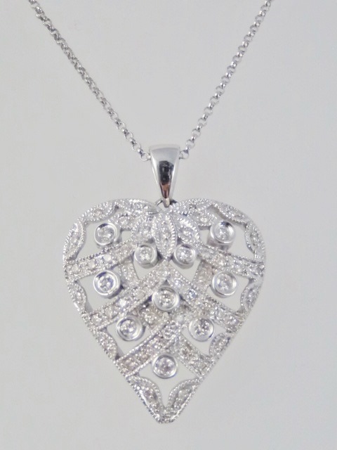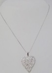 Ladies 14k white gold and diamond heart necklace. The approx diamond weight is .50ct. The chain is 16 inches long. Enlarged Photo.