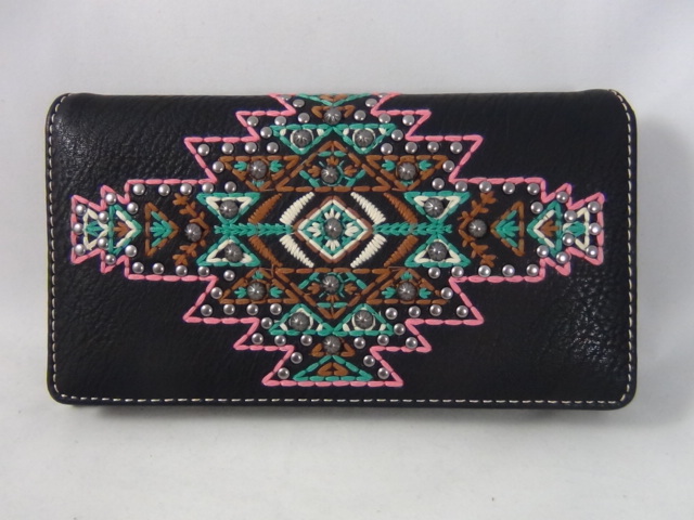 MONTANA WEST BLACK WALLET WITH PINK AND TURQUOISE AZTEC DESIGN. WE HAVE ONE IN STOCK.