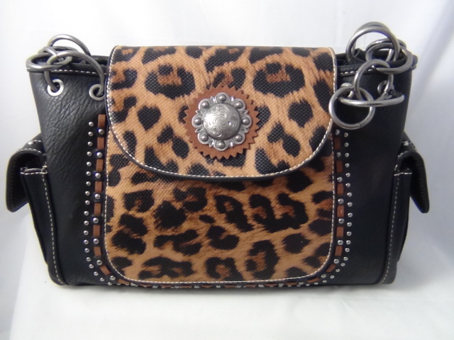 MONTANA WEST CONCEAL AND CARRY BLACK WITH LEOPARD PRINT AND SILVER STUDS. WE HAVE ONE IN STOCK.