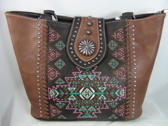 MONTANA WEST CONCEAL AND CARRY BROWN AND BLACK PURSE WITH PINK AND TURQUOISE AZTEC DESIGN. WE HAVE ONE IN STOCK.