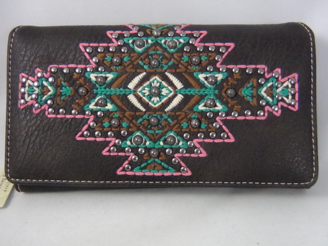 MONTANA WEST DARK BROWN WALLET WITH PINK AND TURQUOISE AZTEC DESIGN. WE HAVE ONE IN STOCK.
