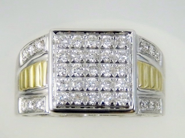 Mens 14k white and yellow gold diamond ring that looks similar to a Rolex. The setting in the front is a square with 5 rows of diamonds. The total diamond weight is 1.01ct.