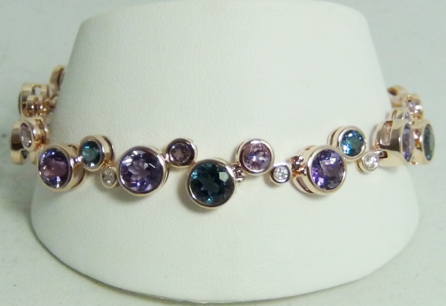 LADIES ROSE GOLD AMETHYST BRACELET WITH LONDON BLUE TOPAZ AND DIAMONDS. WE HAVE ONE IN STOCK.