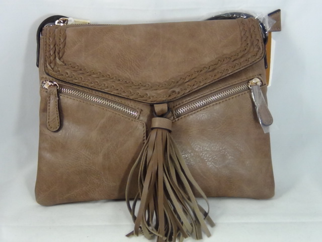 Reddish tan faux alligator wallet with dark brown trim and a rhinestone flower.