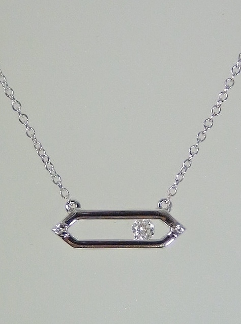 LADIES 14K WHITE GOLD BAR NECKLACE WITH A MOVING DIAMOND. WE HAVE ONE IN STOCK.