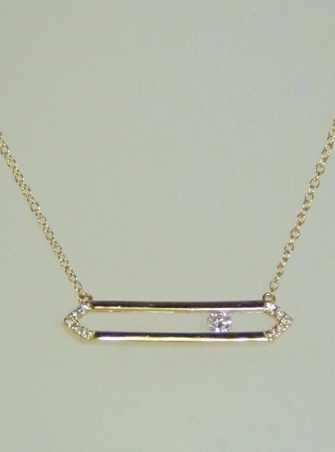 LADIES 14K YELLOW GOLD BAR NECKLACE WITH A .14CT FLOATING DIAMOND. WE HAVE ONE IN STOCK.
