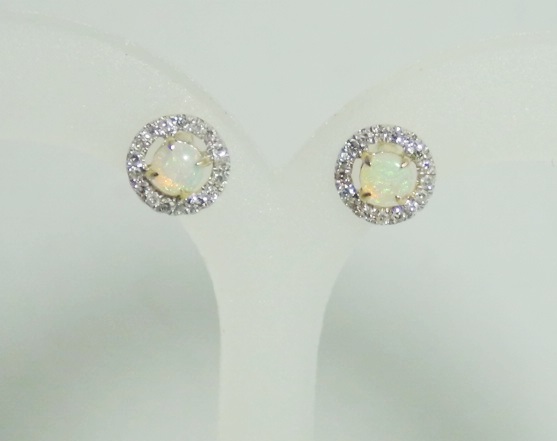 LADIES 14 K YELLOW GOLD OPAL STUD EARRINGS WITH DIAMONDS. TOTAL DIAMOND WEIGHT .10 CT. TOTAL WEIGHT OF OPAL .17 CT. WE HAVE ONE PAIR IN STOCK.
