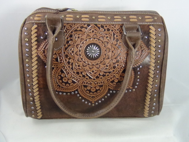 TRINITY RANCH BROWN HANDBAG WITH FLOWER DESIGN AND CONCHO