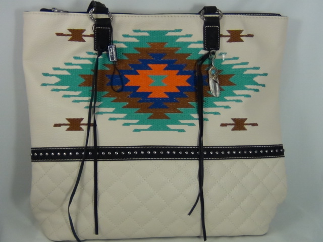 MONTANA WEST CREAM COLORED TOTE WITH TURQUOISE, BROWN, ORANGE AND BLUE AZTEC DESIGN