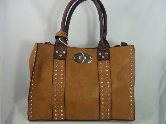 DARK TAN HANDBAG WITH BROWN HANDLES AND GOLD HARDWARE